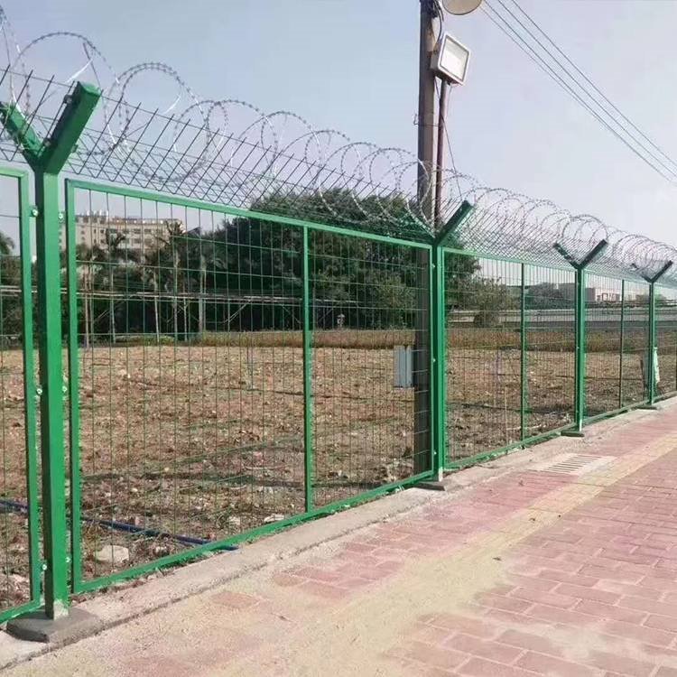 護(hù)欄網(wǎng)直接在地面上裝置時(shí),刺繩的裝置辦法有兩種: Y型裝置法和直線裝置法。Y型裝置法是裝置滾筒刀片刺繩的辦法;直線裝置法是裝置一般刺繩的辦法,直接把刺繩擺開(kāi)固定在立柱或獨(dú)自的固定架上。