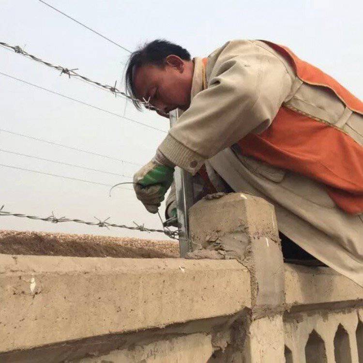 針對刺絲滾籠和雙股刺繩對于上鋅量是明顯的要求了,此外包括一些安裝長度和直徑等等方面要求也是比較多的。張開后形成蛇腹網狀,閉合后刀片刺繩圈徑為50cm,張開后每交叉圈安裝間距20cm,直徑不小于45cm,刀刺寬度22mm,兩刃垂直間距15cm,刀刺縱向間距34mm,芯絲直徑為2.5mm,刀片采用厚度0.5mm的Q195鋼板沖切制作,芯絲由HPB300直徑6.5m高線鋼絲冷拔加工。這樣名列出嚴格的技術要求也是為了保障安全和使用壽命。這里面我們要指出的一點就是小型的支架是為加密而設計的,而最大的刺繩支架是在階梯交接的地方進行安裝和固定的。安裝工序是肯定是先固定支架了,一般都有專門的u型螺栓抱咂在水泥制的圍欄上面只需要固定.