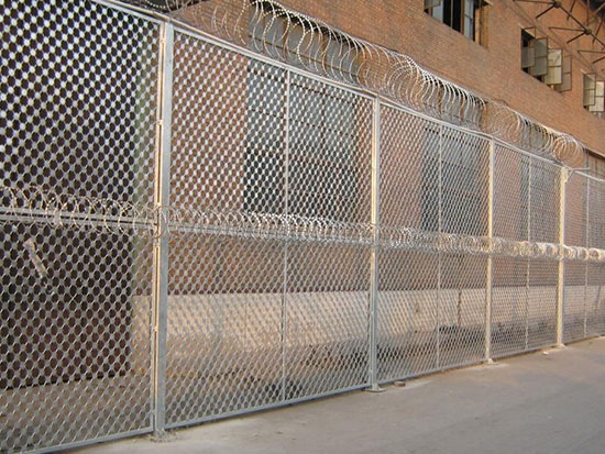 4、監獄鋼網墻防攀爬能力極強、加強網片增加了其被破壞的程度、使用時間長、堅固耐用。螺旋型交叉刀片刺網是在兩條刀片刺網之間以不銹鋼片和鍍鋅鋼片強力夾扣,展開后即呈交叉狀,美觀又實用。