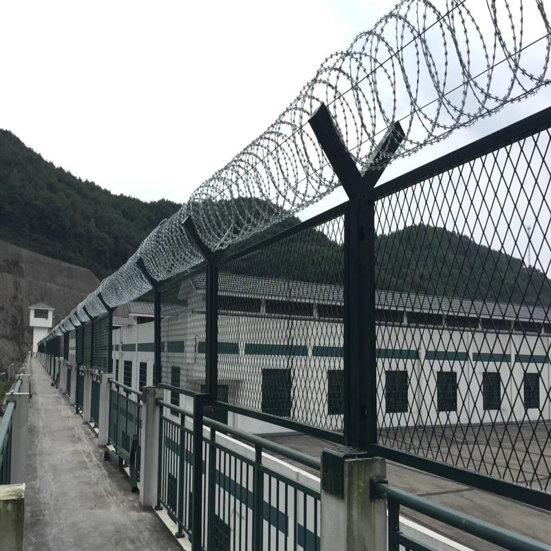 監獄護欄網又稱作“Y型安全防御護網”,是由V型支架立柱,加強型焊接片網。安全防盜連接件和熱鍍鋅刀片刺籠組成強度和安全防御性級別很高。