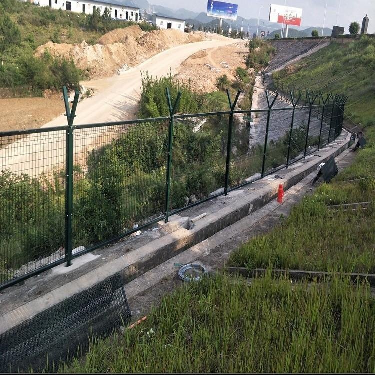 機場圍界隔離網又稱作“Y型安全防御護網”,是由V型支架立柱,加強型焊接片網,安全防盜.連接件和熱鍍鋅刀片刺籠組成強度和安全防御性級別很高。近年來,被廣泛應用在機場,軍事基地等高安全場所。在隔離網頂部加裝刀片刺絲、刀片刺繩后又很好的增強了防護性能。