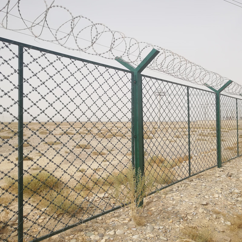 1、隔離防護網:采用刀片刺繩菱形網格形式,低碳鋼絲材質,
